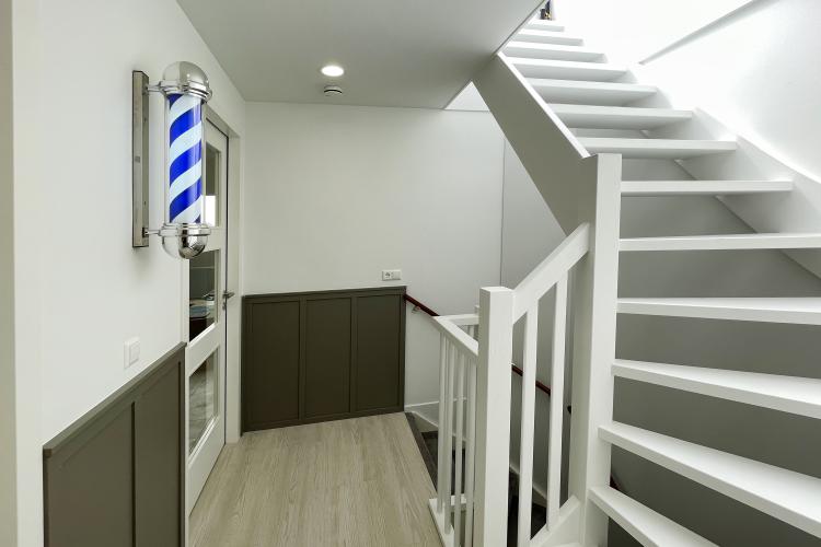 De bestaande onafgewerkte zolder hebben we getransformeerd tot een multifunctionele verdieping met een bergruimte, wasruimte en als klapstuk de kappersruimte die er nu uit ziet als een salon.